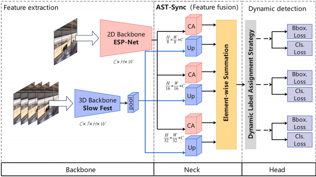 針對以上問題,團(tuán)隊(duì)提出了一種基于巡檢機(jī)器人和時(shí)空特征融合算法(Cattle-ES3D)的肉牛呼吸急促和流涎行為檢測方法(圖1)。團(tuán)隊(duì)首先提出了一種混合架構(gòu),將嵌入式空間金字塔網(wǎng)絡(luò)和SlowFast雙通路網(wǎng)絡(luò)集成在一起,實(shí)現(xiàn)肉牛行為時(shí)空特征的提取;其次,設(shè)計(jì)了自適應(yīng)時(shí)空特征融合同步模塊,實(shí)現(xiàn)時(shí)空特征的自適應(yīng)融合;最后,設(shè)計(jì)了一個(gè)輕量級的動(dòng)態(tài)檢測分支,通過時(shí)空動(dòng)態(tài)標(biāo)簽賦值驅(qū)動(dòng)的多維參數(shù)優(yōu)化機(jī)制,實(shí)現(xiàn)分類-回歸特征空間對齊和時(shí)間關(guān)聯(lián)約束。實(shí)驗(yàn)結(jié)果表明,該方法具有時(shí)空特征,提高了肉牛呼吸急促和流涎行為的檢測精度,降低了計(jì)算成本。