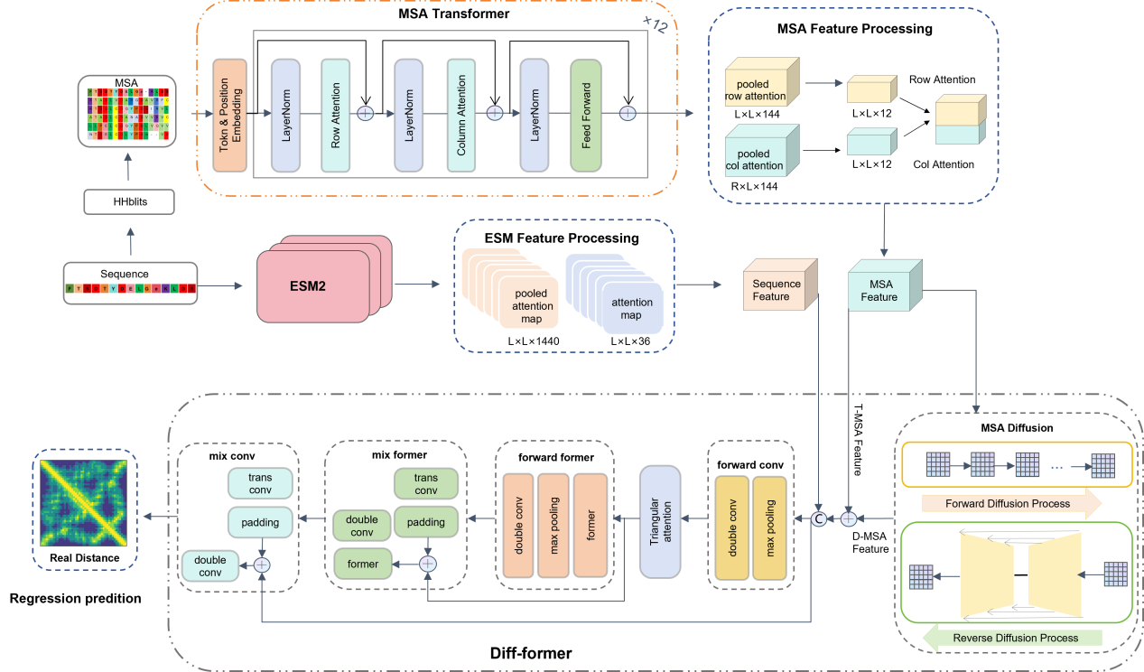 團(tuán)隊(duì)基于ESM與MSA Transformer兩個(gè)大模型構(gòu)建了MF-ProtDisMap 大模型框架,該框架通過(guò)三項(xiàng)核心設(shè)計(jì)實(shí)現(xiàn)了性能提升:其一,雙通道特征提取模塊同時(shí)捕捉蛋白質(zhì)序列特征與共進(jìn)化語(yǔ)義信息;