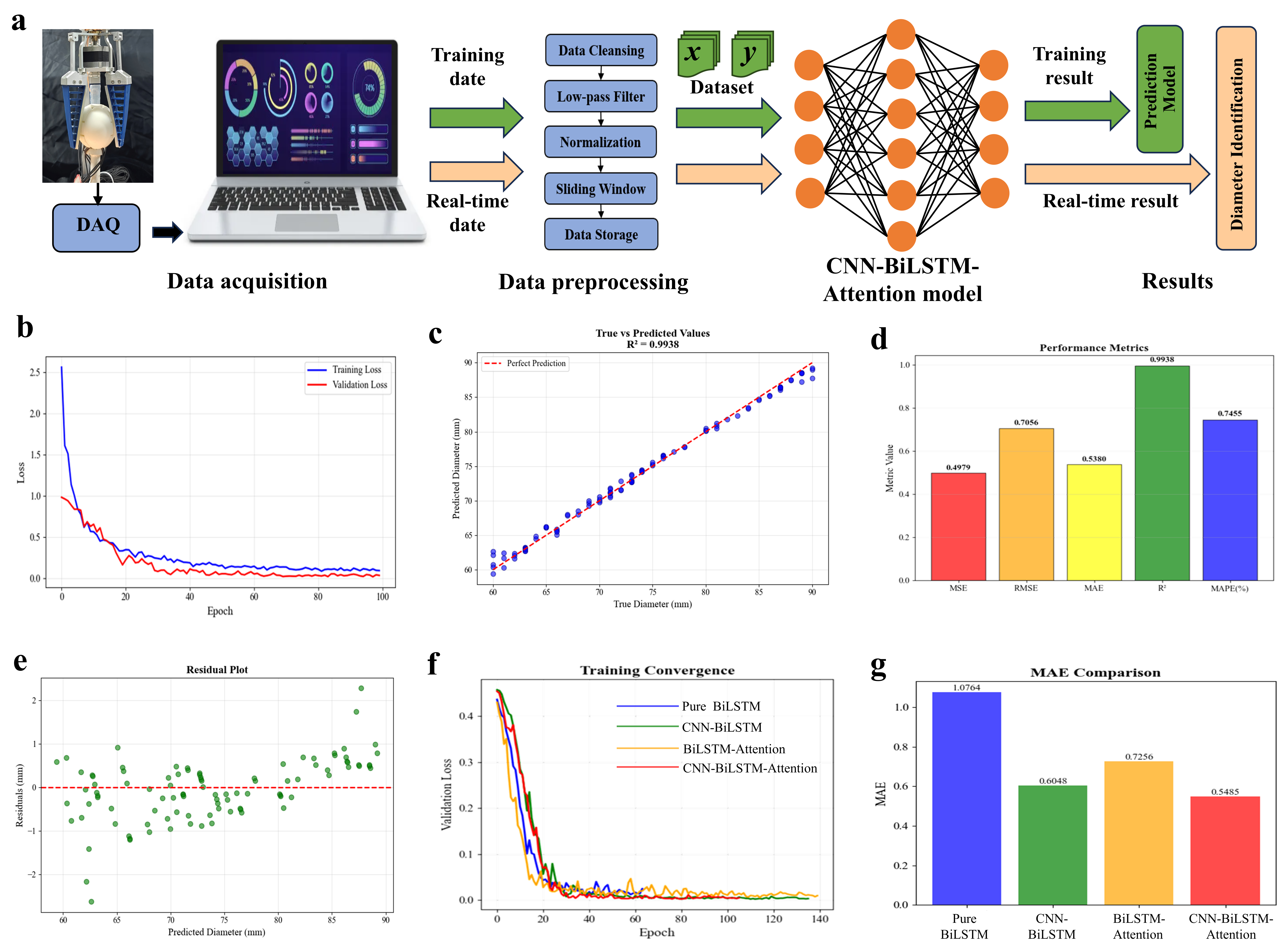 針對以上技術難題,研究團隊提出了一種融合柔性力感知與深度學習的蘋果果徑實時檢測與分級新方案,實現了采摘與尺寸分級的同步一體化作業。研究團隊將自主研制的離子凝膠摩擦納米發電機(IG-TENG)部署于三指Fin-Ray柔性末端執行器。該系統能夠實時、靈敏地采集末端執行器與蘋果的力時序數據。為實現尺寸的精準預測,團隊構建了一種新型的CNN-BiLSTM-Attention混合深度學習網絡。該模型能夠實時融合抓取過程中的力感知時序數據、電機的行程數據和果實位姿信息。通過CNN提取局部特征,BiLSTM捕捉長時序依賴,Attention機制聚焦關鍵時間步,模型可以擬合不同抓取條件與果實幾何尺寸之間的復雜映射關系。田間試驗結果表明,該果徑預測方法與人工測量值相比,平均絕對誤差(MAE)僅為2.13 mm,尺寸分級正確率高達92 %。這一研究為智能采摘裝備的無損作業和精準分揀提供了高效、低成本且可靠性強的新技術路徑。