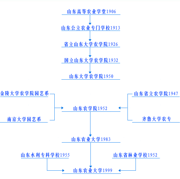 山東農業大學是一所具有百年歷史的名校。其前身是1906年(清光緒32年)創辦于濟南的山東高等農業學堂。1913年改名為山東公立農業專門學校。1926年,公立農專與其他五所專門學校合并,成立了省立山東大學,其中公立農專成為省立山東大學農學院。1928年改為國立山東大學農學院,遷址青島。1937年因抗戰爆發,學校由青島遷四川萬縣辦學,1946年遷回青島復校。當時的山東大學農學院設農藝、園藝、水產三個系及一個農場。同一時期,1947年山東省立農學院在濟南原公立農專舊址宣告成立,設有農藝、園藝、森林、農業經濟四個系,后改名為山東農學院。1952年10月,根據國家教育部關于院系調整的意見,山東省立農學院與當時的山東大學農學院合并,同時調入齊魯大學農業???、金陵大學園藝系、南京大學園藝系果樹組,組成了新的山東農學院,校址在濟南。新的農學院匯集了陳瑞泰、李家文、丁巨波、王清和等一大批國內外知名的專家教授,經他們數十年不懈的努力,為學院和學科的發展建設奠定了堅實的基礎。1958年,學校遷址泰安,由山東農學院、山東林學院、山東畜牧獸醫學院、泰安農業專科學校、泰安水利學校合并建立山東農業大學,1959年改稱山東農學院。此后幾十年,雖然也有過一些調整,但學校的主體沒有大的變動。1983年9月,經教育部和山東省人民政府批準,山東農學院改名為山東農業大學。